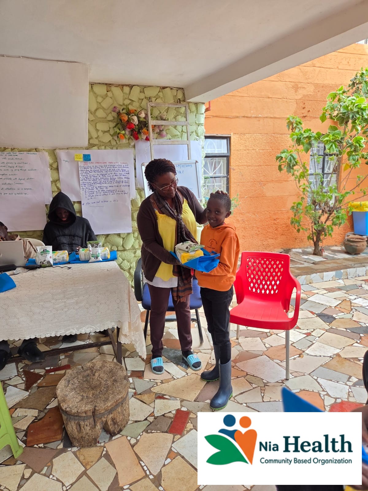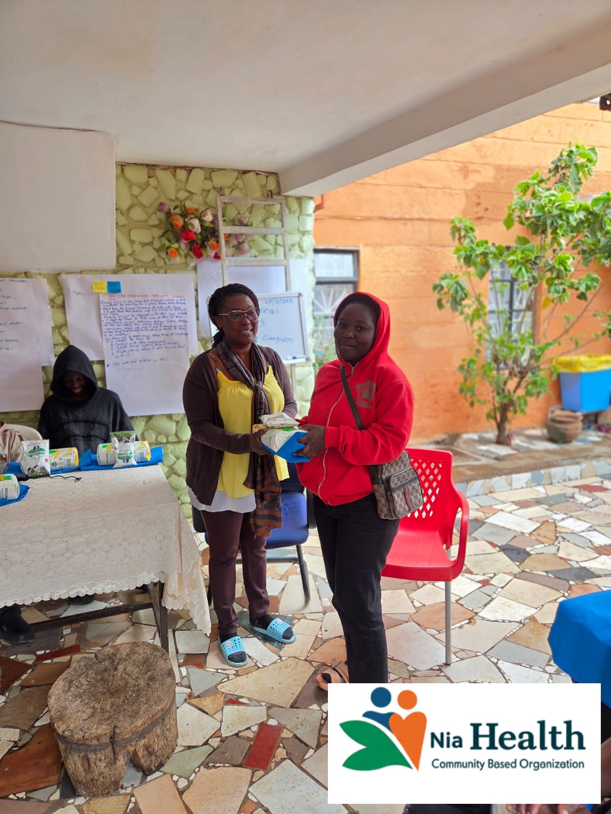 Nia Community Members Holding Food In Nema Bags Given To Them